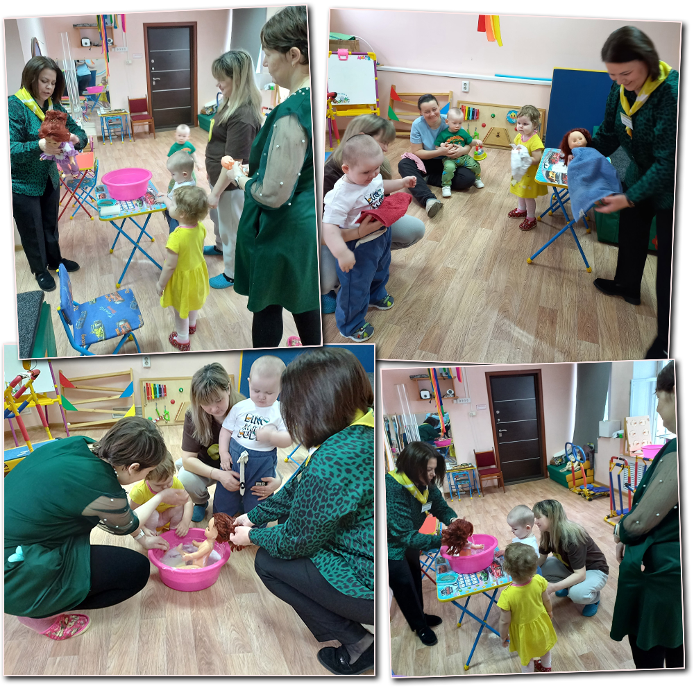 Малыши с удовольствием отозвались на предложение специалиста помочь искупать куклу Катю, так как кукла пришла к ним в гости чумазая и испачканная. Ребята очень внимательно наблюдали за процессом купания куклы и даже сами помогали в этом. Во время купания дети запоминали названия предметов как: ванночка, мыло, мыльница, полотенце и т.д., действия; смывать, намыливать, вытирать, пополняли речь прилагательными: холодная, теплая. На примере куклы дети учились, как правильно мыть руки, умываться, насухо вытирать руки полотенцем. Детям очень было интересно принимать участие в купании куклы, у них не только появилось желание играть с куклами, но и «заботиться» о них. Все вместе спели потешку: «Ой, водичка хороша, хороша водичка! Искупаем малыша, чтоб сияло личико!». Затем куклу Катю уложили спать и спели ей колыбельную песню. Так в ходе игры ребята получили хороший эмоциональный заряд и закрепили знания этапов купания куклы. А это формирует первоначальное представление о ценности здоровья и соблюдение личной гигиены.